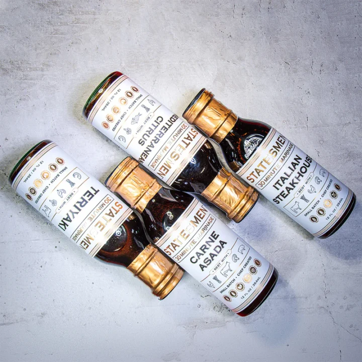 Statesmen marinades have the ability to transform everything from family dinners to backyard barbecues with minimal effort. These versatile blends make it easy to create flavorful, memorable meals. DON’T KNOW WHICH ONE TO CHOOSE? YOU DON’T HAVE TO WITH THE SAMPLER. YOU RECEIVE 1 OF EACH FLAVOR. CARNE ASADA, ITALIAN STEAKHOUSE, TERIYAKI, & MEDITERRANEAN CITRUS. All are gluten-free, vegan, all-natural products with simple ingredients, all-natural preservative(citric acid).