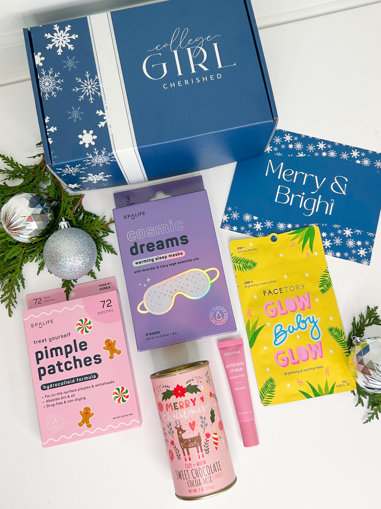 Turn an ordinary night into a mini spa retreat with our spa-inspired College Girl Cherished® care packages–perfect for college girls who could use a little calm. Treat your college girl to our limited edition Christmas gift box with a brightening facial mask, soothing eye mask, pimple patches, hydrating lip balm, and comforting cocoa drink or indulge her with our 3 month happy mail plan.