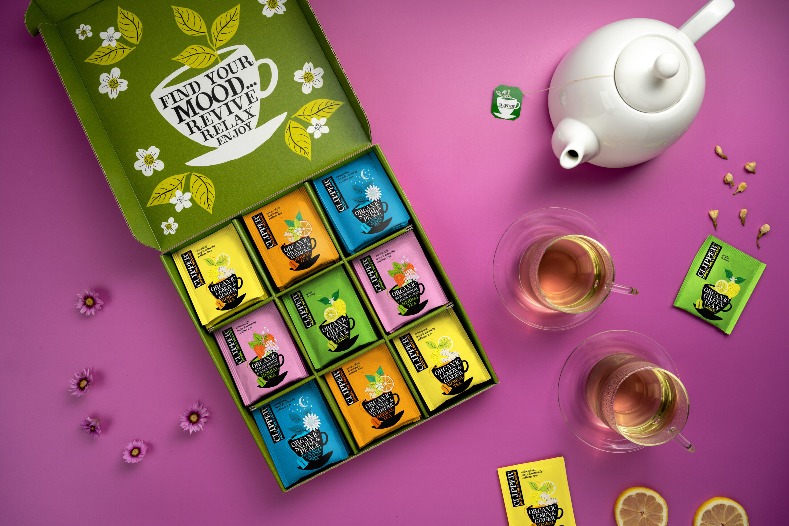 A selection of Clipper’s finest organic herbal and green teas that make for a delicious gift for yourself, family or friends. Contains 45 total organic enveloped unbleached tea bags, and five different flavors – Organic Lemon & Ginger Herbal Tea, Organic Orange & Turmeric Herbal Tea, Organic Green Tea & Lemon, Organic Snore & Peace Herbal Tea and Organic Strawberry & Elderflower Herbal Tea.