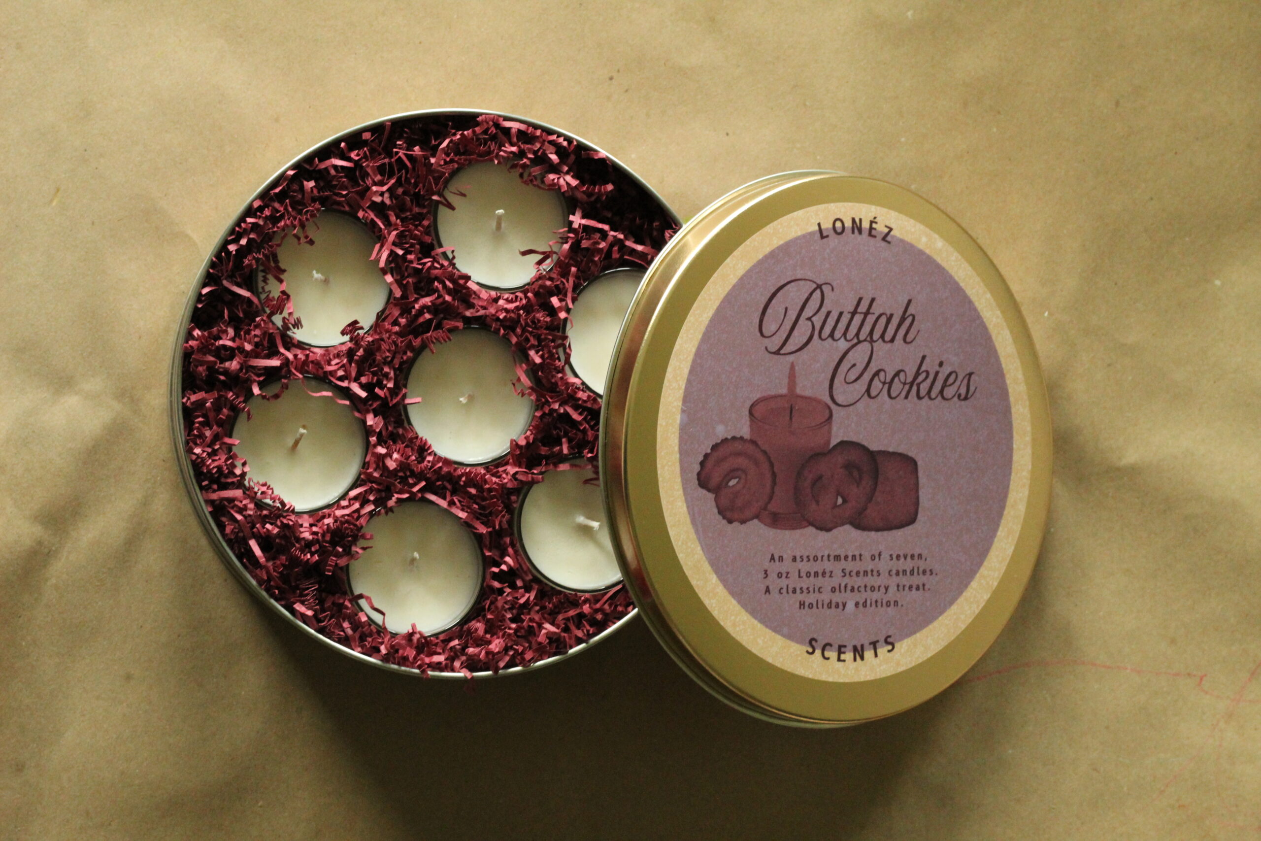 Keeping tradition alive with no cookies inside. A keepsake ‘Buttah Cookie’ tin containing 7 seasonal candles. A lighthearted nod to the surprise we experienced as children when we opened a butter cookie tin and found no cookies.