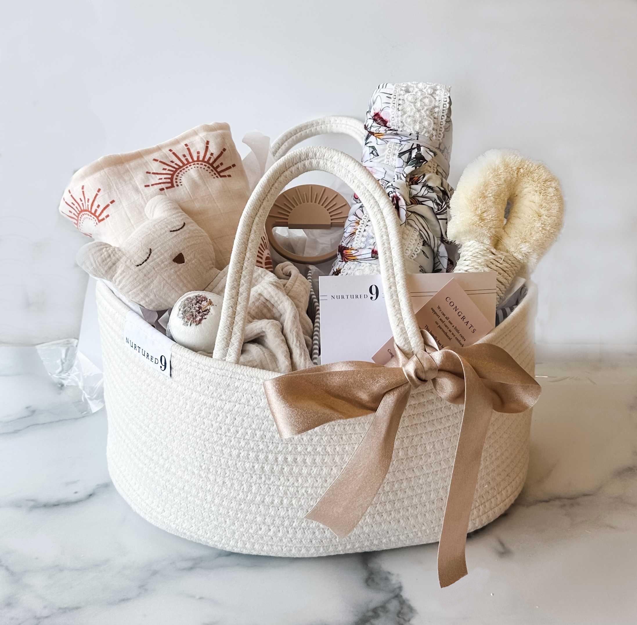 The Nurtured 9 Mom & Baby Care Package is the perfect way to send love and care to the new Mama AND her brand new baby! It includes items that comfort and soothe both Mom and baby during their first days and weeks together, including a maternity/postpartum robe, a dry brush, and a lavender, rose & cedarwood bath bomb for Mom, plus a diaper caddy, swaddle blanket, bear lovey, and silicone sun teether for baby. You can shop all of our signature pregnancy and new mom gifts OR curate-your-own pregnancy gift box at Nurtured9.com!